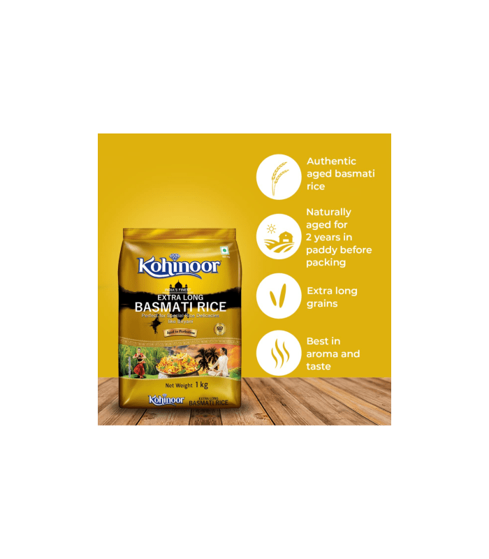 Kohinoor India's Finest Extra Long Basmati Rice stands as one of India's finest, nurtured by the pure waters of the Himalayan rivers. Carefully aged for two years in paddy fields, it ensures easy digestion and maintains moisture during cooking. This special basmati rice boasts exceptional grain length, doubling in size after cooking. Each elongated grain offers a fluffy texture and rich aroma, perfect for special occasions. Ideal for dishes like biryani, pulao, and steamed jeera rice, these premium grains are naturally cultivated and cared for, ensuring their ultimate flavor and aroma enhance your festive meals. At Kohinoor, we prioritize excellence at every stage, from field selection to grain curation, dedicated to bringing authentic meals to your table. Kohinoor Basmati Rice invites discerning palates to savor this magnificent experience and elevate every mealtime moment.