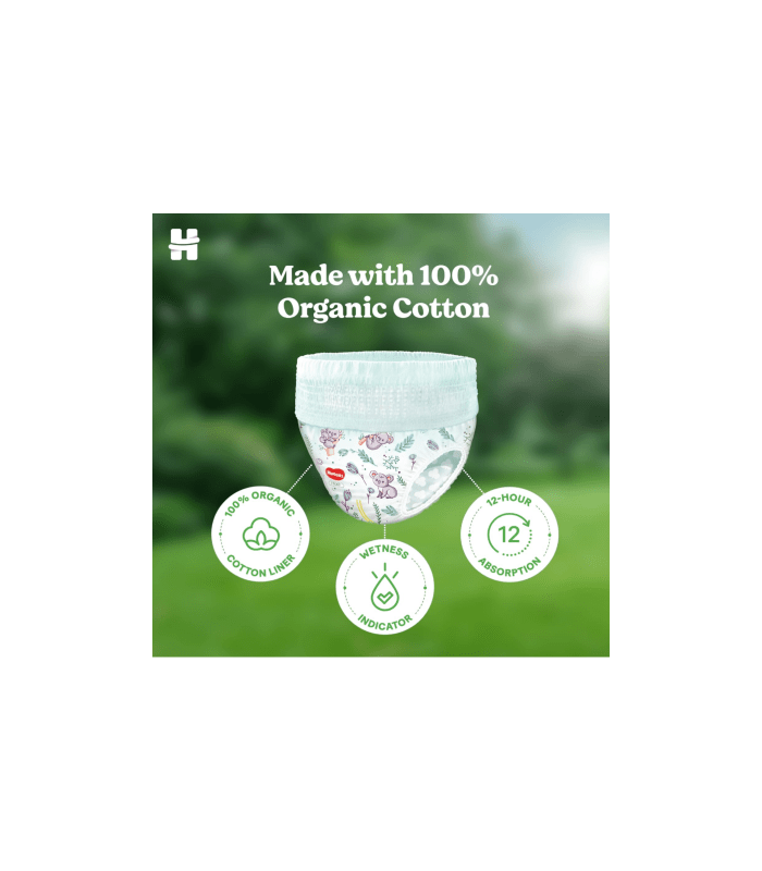 Huggies Nature Care Pants feature 100% organic cotton, ensuring maximum comfort for your baby's sensitive skin. These diapers are free from parabens, chlorine, and latex, providing a gentle and safe experience. With up to 12 hours of absorption, they keep your baby dry and comfortable throughout the day. The wetness indicator alerts you when it's time for a change, making these diaper pants a convenient and dependable choice for parents.