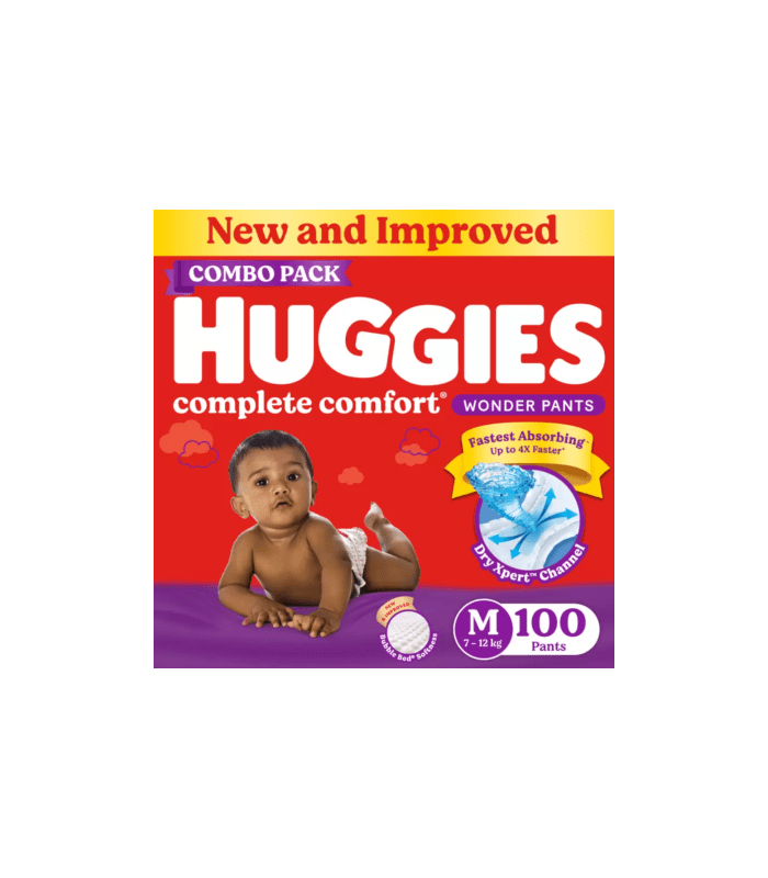 Introducing the new and improved Huggies Complete Comfort Wonder Pants, India's fastest-absorbing diaper featuring Patented Dry Xpert Channel technology. These medium-sized (M) diapers are designed for babies weighing 7 to 12 kg. Enjoy a peaceful night's sleep with up to 12 hours of overnight absorption and a superior dry feel with up to 4X faster urine absorption. The double leak guard helps prevent thigh leakage, and the breathable material allows your baby's skin to breathe. Additionally, our diaper pants feature India's first-ever Bubble Bed technology, providing a soft inner layer for ultimate comfort. Available in various sizes: Newborn, S, M, L, XL, XXL, and XXXL.