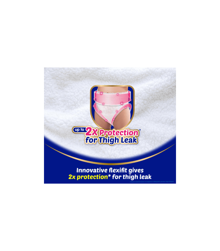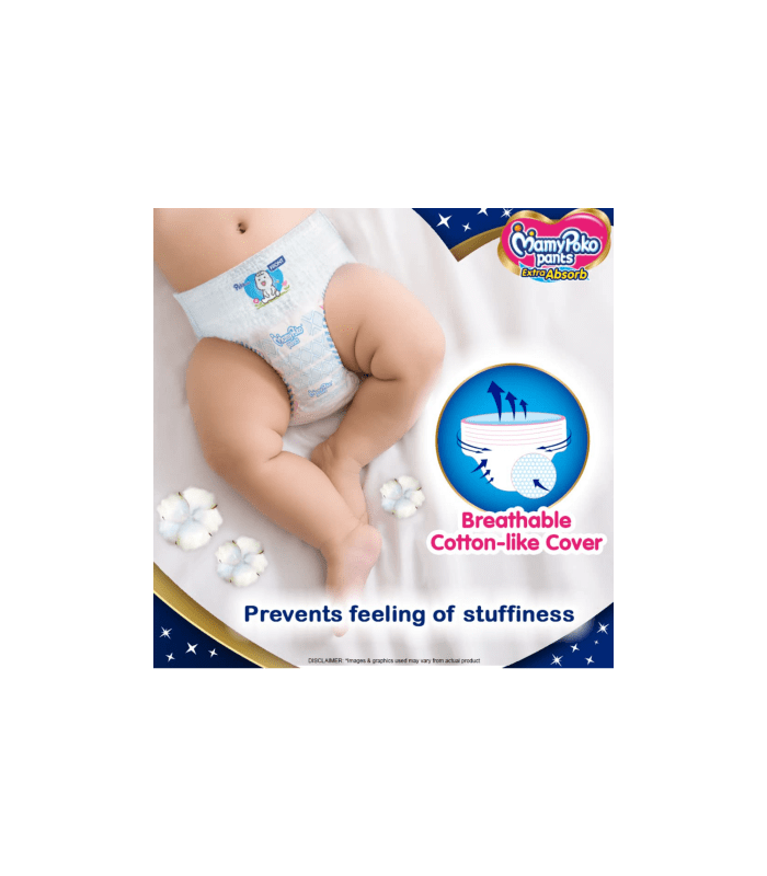 MamyPoko Pants Extra Absorb features a new "Widespread Crisscross Sheet" with 50% more absorption area on the sides, allowing for quick and repeated urine absorption for up to 12 hours.