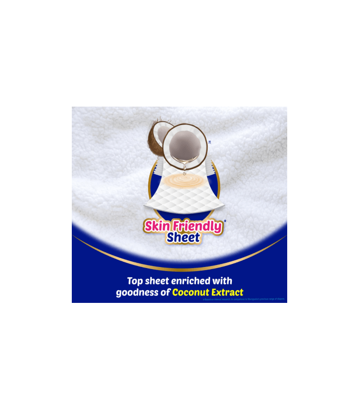 The deep absorbent crisscross sheet absorbs urine thoroughly, keeping the topsheet dry and preventing leakage for up to 12 hours without causing sogginess. The innovative Flexi Fit design gently adjusts and evenly distributes pressure across the baby's tummy and back, offering double protection against thigh leakage. The topsheet, enriched with coconut oil, is gentle on the skin and helps prevent thigh gaps and redness. These pant-style diapers are also easy to put on and take off.