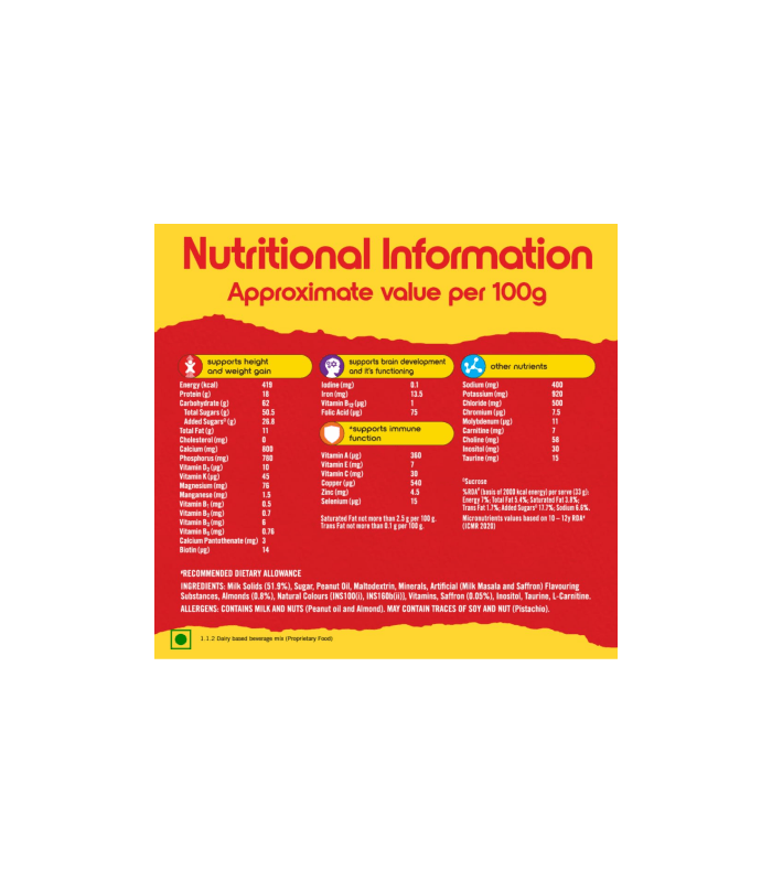 PISTA BADAM FLAVOUR: Complan Pista Badam Flavour is a nutritious dairy-based beverage mix that offers a delicious taste kids will love. It helps promote faster growth.
