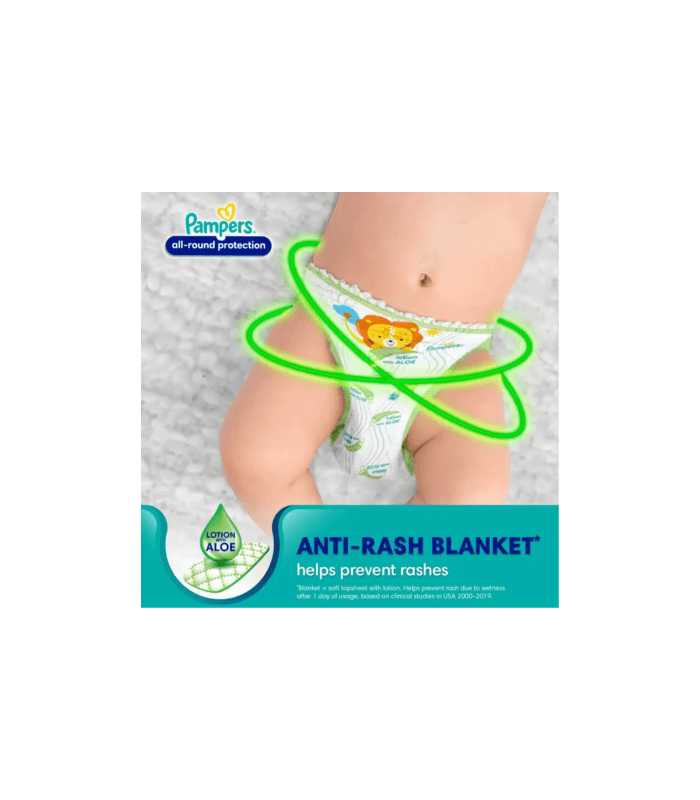 Pampers All Round Protection Pants for Newborns (54 Pieces, Up to 5 kg) feature an anti-rash layer with Aloe Vera lotion to protect your baby's skin from redness and rashes. These high-quality diaper pants offer up to 100% wetness lock, ensuring your baby stays dry throughout the night. The design includes air channels and a stretchy waistband for a breathable and comfortable fit, even in summer. Pampers' unique Magic Gel technology provides up to 12 hours of dryness with twice the absorption speed. The new and improved design features extra soft material that adapts to your baby's movements for optimal comfort.