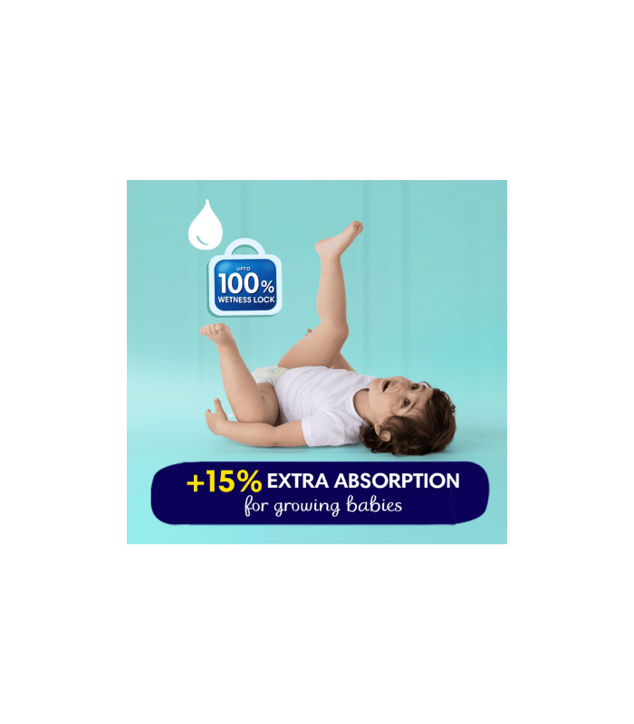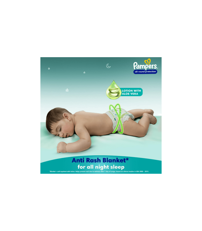 The new and improved Pampers All-round Protection Pants feature an anti-rash layer with Aloe Vera lotion to protect your baby’s skin from rashes. These pants offer up to 100% wetness lock, keeping your baby dry all night. Pampers' unique Magic Gel technology provides up to 12 hours of dryness with twice the absorption speed, aided by the soft top sheet.