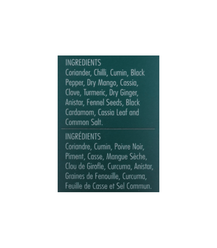 Ingredients: Anistar, Black Cardamom, Black Pepper, Caraway, Cassia, Cassia Leaf, Chilli, Clove, Common Salt, Coriander, Cumin, Dry Ginger, Dry Mango, Fennel, Turmeric Country Of Origin: India