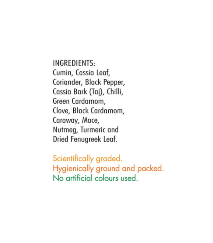 Ingredients: Black Cardamom, Black Pepper, Caraway, Cardamom, Cassia, Cassia Leaf, Chilli, Clove, Clove Leaf, Coriander, Cumin, Kasuri Methi, Mace, Nutmeg, Turmeric.