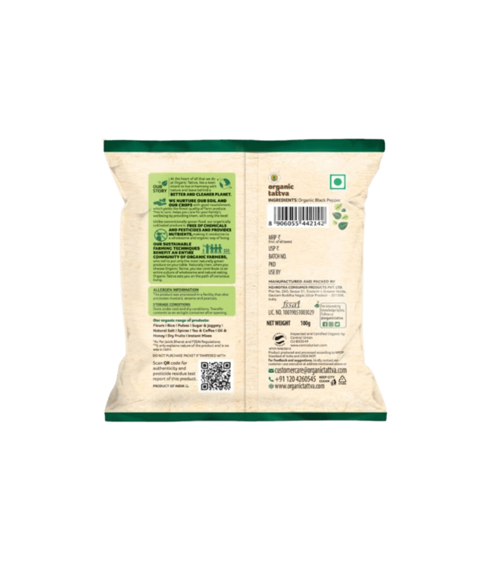 Organic Tattva Black Pepper supports digestion and contributes to intestinal well-being. Completely natural and free from pesticides, it is an excellent option for enhancing the flavors of dishes like Pongal and khichdi. Packed with protein, iron, and calcium, it also provides dietary fibers, vitamins, and a range of other essential nutrients..