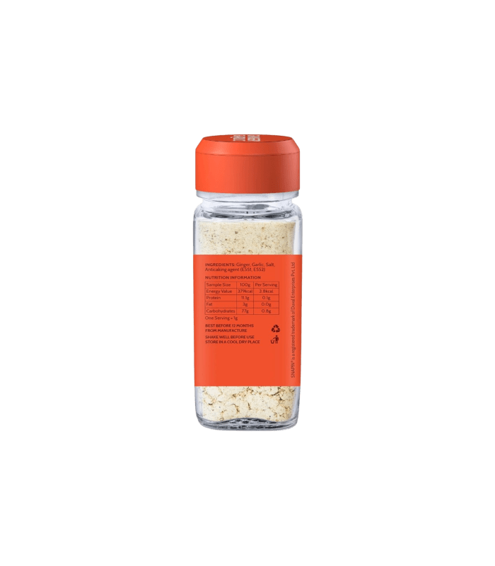 Snapin Ginger Garlic Powder emerges as a culinary necessity, skillfully combining the robust and aromatic fusion of high-quality ginger and garlic. This meticulously crafted powder delivers the genuine essence of these vital ingredients to your dishes, eliminating the tedious tasks of peeling and chopping. With precision in sourcing, it provides a hassle-free and adaptable solution for infusing a flavorful and savory dimension into a variety of cuisines. Whether used in marinades, stir-fries, soups, or stews, Snapin Ginger Garlic Powder enhances your culinary journey, establishing itself as an essential partner in every kitchen. Streamline your cooking process and enhance the taste profiles with the authentic touch of Snapin Ginger Garlic Powder.