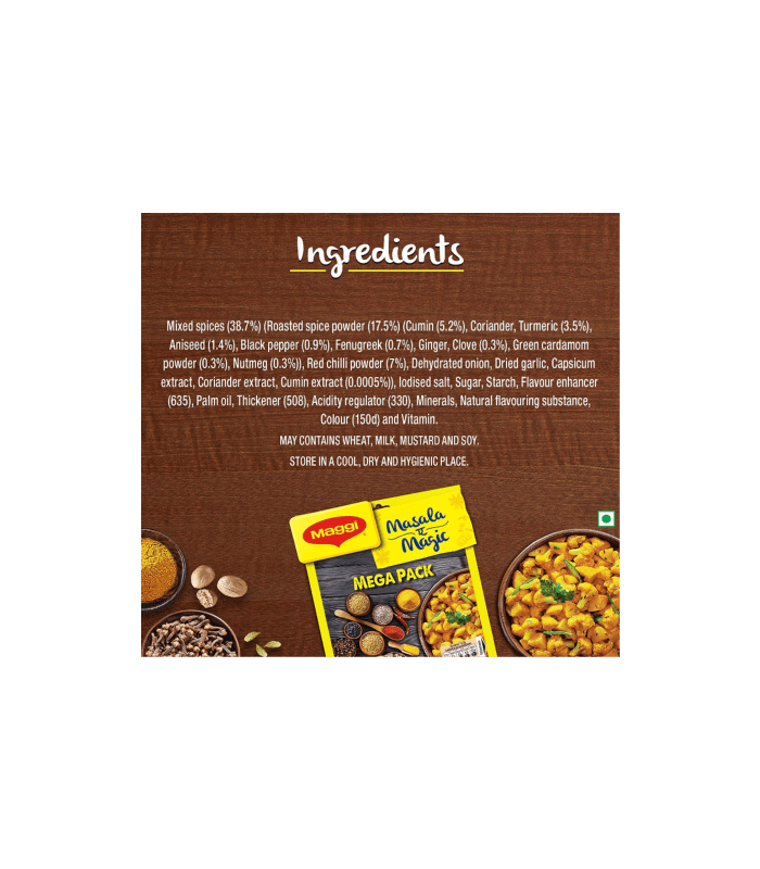 Key Features: Maggi Masala-ae-Magic presents a flawless fusion of 10 carefully selected, aromatic, and roasted spices. This secret ingredient transforms your daily vegetables into an extraordinarily tasty delight. Now, even your children will develop a fondness for everyday vegetables. Ideal for a variety of dishes such as Sabzi, Dal, Paneer, Pasta, and more. Each serving (2g) contributes to 15% of your daily requirements for Vitamin A, Iron, and Iodine.